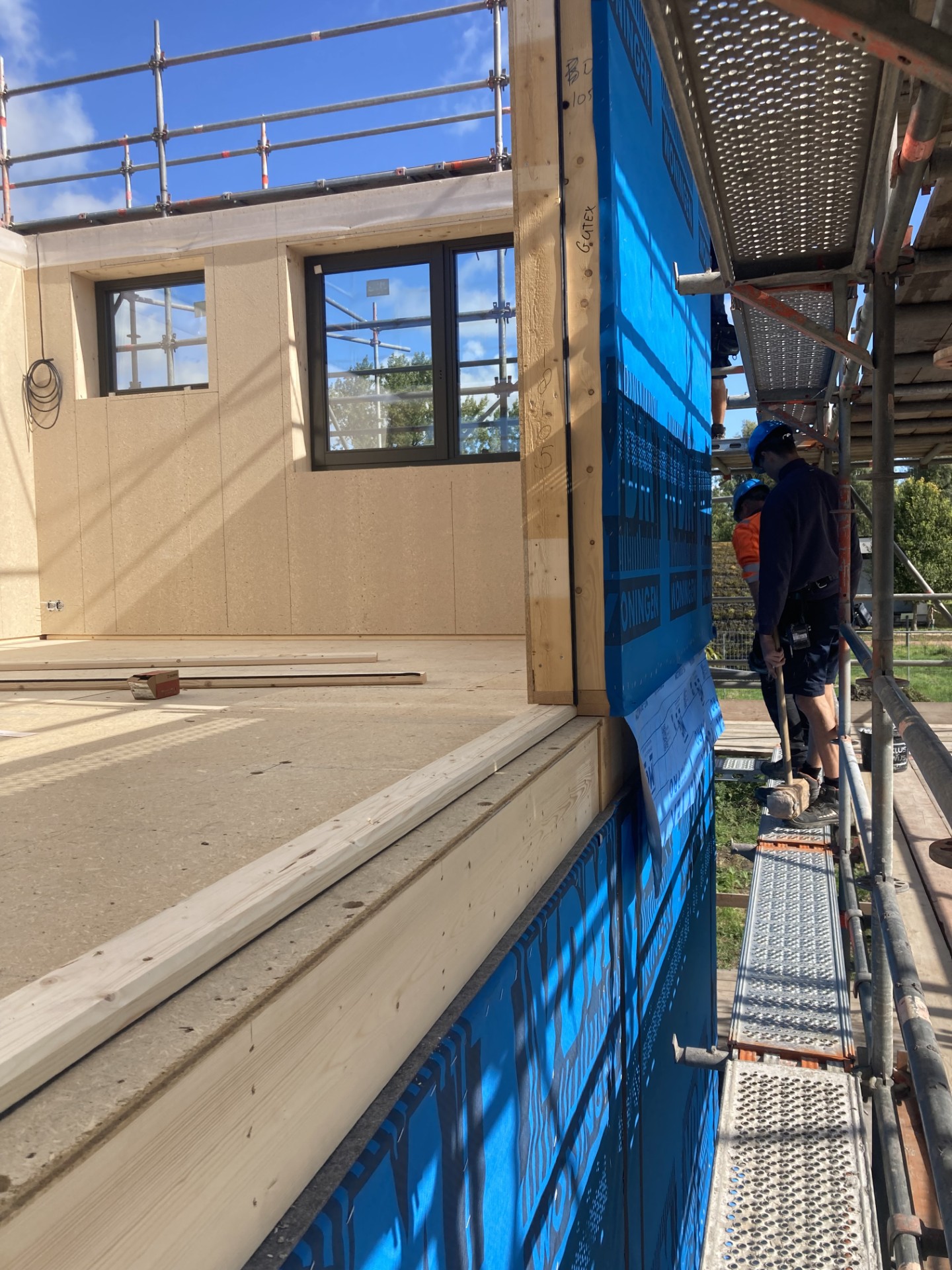 De biobased test- en demowoningen op het terrein van BuildinG in Groningen zijn bijna gereed. Rond de eerste woning zijn de steigers inmiddels verwijderd en ook binnen is de afbouw vergevorderd. Daarmee komt het moment dichterbij waarop we kunnen starten met het monitoren van het vocht- en warmtegedrag in verschillende biobased constructies, toegepast in gevel, beganegrondvloer en het platte dak.