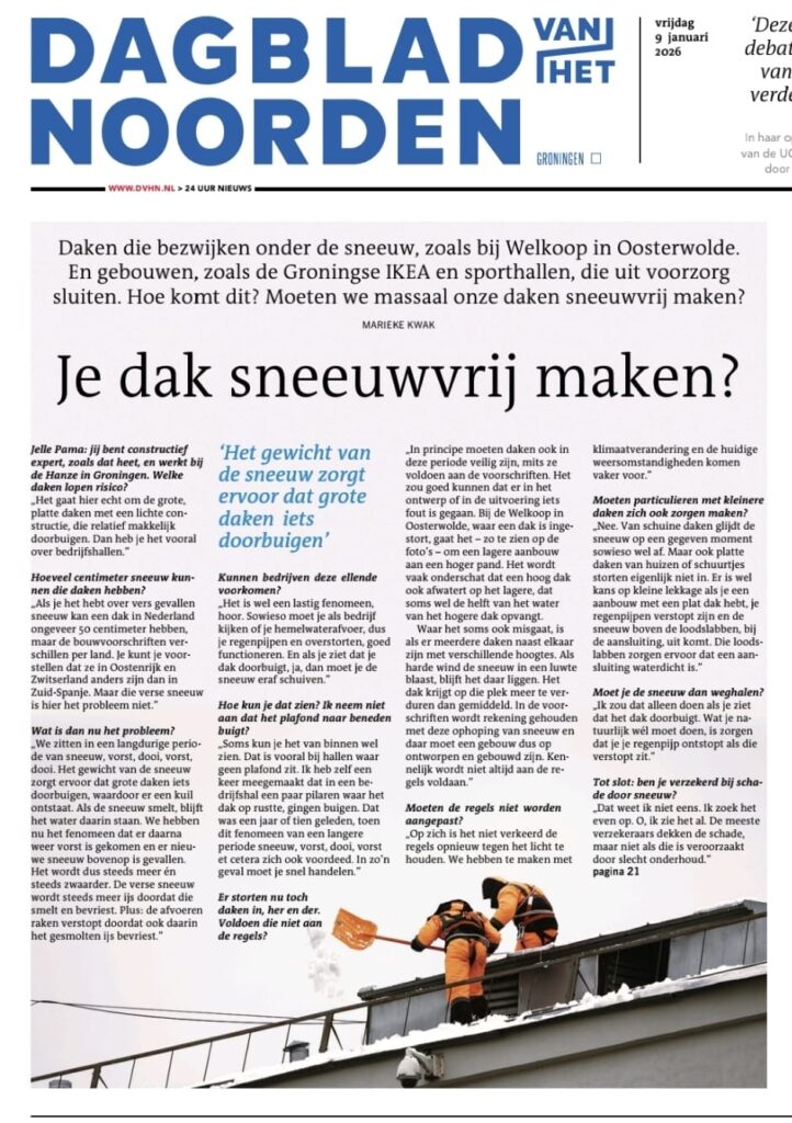 In het Dagblad van het Noorden verscheen op vrijdag 9 januari een uitgebreid interview met Jelle Pama, programmamanager bij BuildinG, over de risico’s van extreme sneeuwval op daken. Aanleiding zijn gebouwschades en tijdelijke sluitingen van onder meer grote winkels en sporthallen na zware sneeuwval.